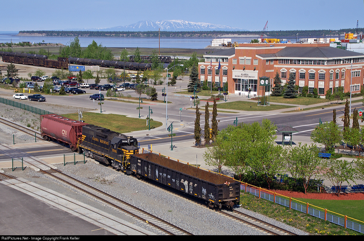 ARR 3006 crosses C Street in front of the Alaska Railroad's General Office Building en-route to the APU spur to switch out several customers. The APU Spur is the closest thing o street running the Alaska RR has and is currently under going some upgrading. In the background is Mt Susitna.