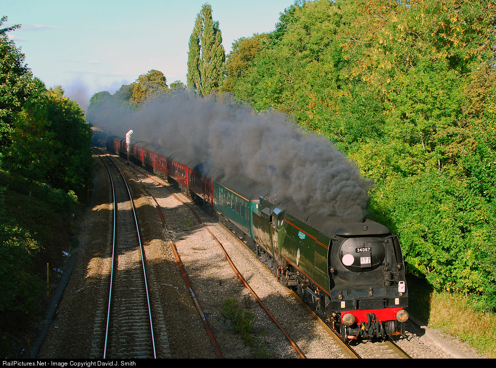 | Bulleid Light Pacific 34067 "Tangmere" storms up the bank towards Tuffley Junction,Gloucester,on a wonderful Autumn evening.The loco was working a return excursion from Worcester to London Paddington. |