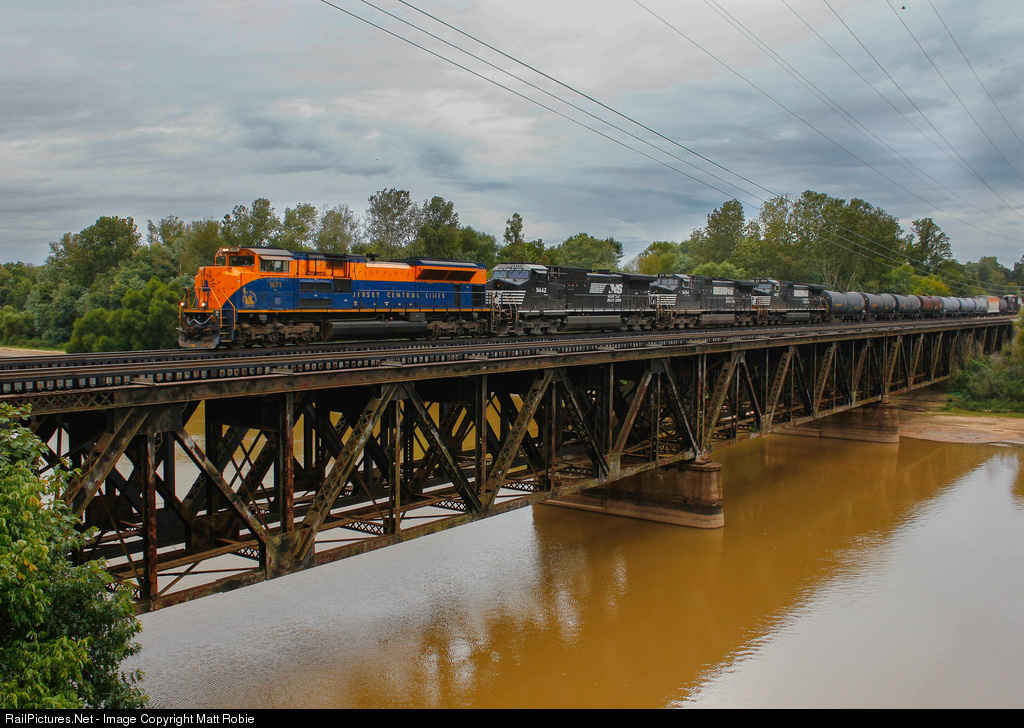 NS 154 crosses the Yadkin River trestle with the colorful Jersey Central heritage unit on the point. The vibrant blue and orange really added a splash of color to a drab day!