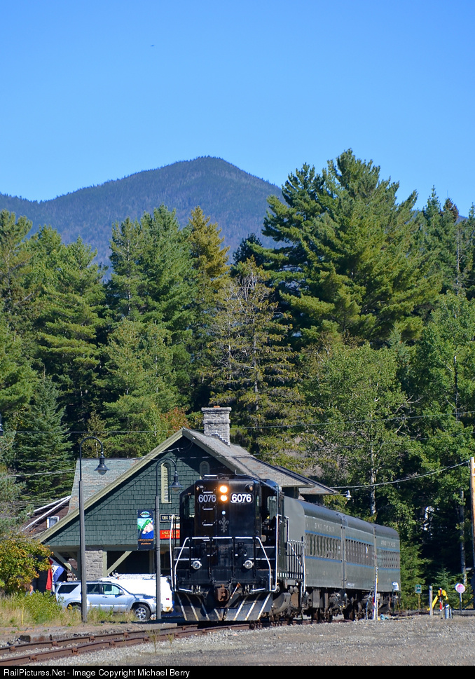 | Dwarfed by the Adirondack high peaks. The Adirondack Scenic station and train at Lake Placid is dwarfed by the Adirondack high peaks on a gorgeous fall afternoon. The train will depart for Saranac Lake shortly with ex-PRR GP9 ADIX 6076 leading three cars in NYC-inspired colours. |