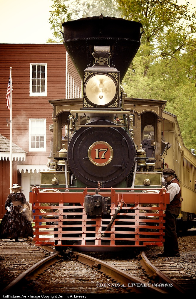 Steam Into History's No. 17, AKA the "York", sees its engineer doing the time honored "oiling around" of the locomotive while stopped at Hanover Junction Pennsylvania. This once common activity became unnecessary when the latest models of steam locomotives that had their lubricating systems. It was very interesting to see for I am used to crews of big steam like NKP No. 765 using Alemite guns. Because there are no Alemite grease fittings on the No. 17, instead there are oil cups at crucial bearing's that only hold about a 1/8 cup of oil. So at every stop the engineer has to utilize his badge of office the, oil can. The building in the background is the Hanover Junction station. Abraham Lincoln passed this very building to and from Gettysburg. His funeral train did the same. If you wish a time travel machine, Steam Into History is the place to be.