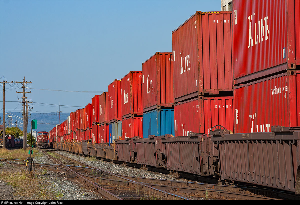 CP 9116 waits for a new crew at the Depot in Thunder Bay, Ontario, while an eastbound container train passes.