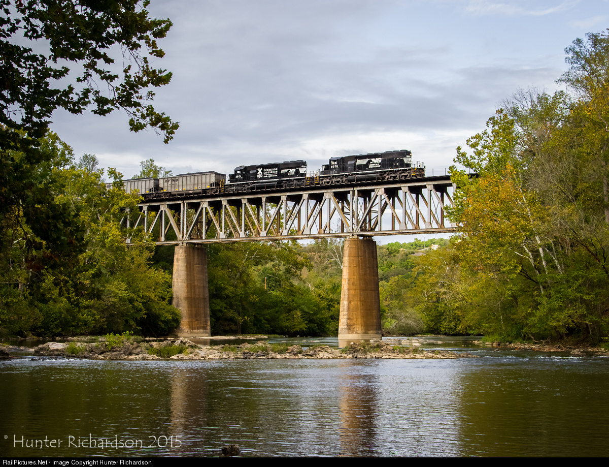 | Under threatening skies, a pair of Norfolk Southern SD40-2's work southbound with a coal train on trackage rights via the Clinchfield (CSX KP Sub) across the North Fork of the Holston River in Kingsport, Tennessee. |