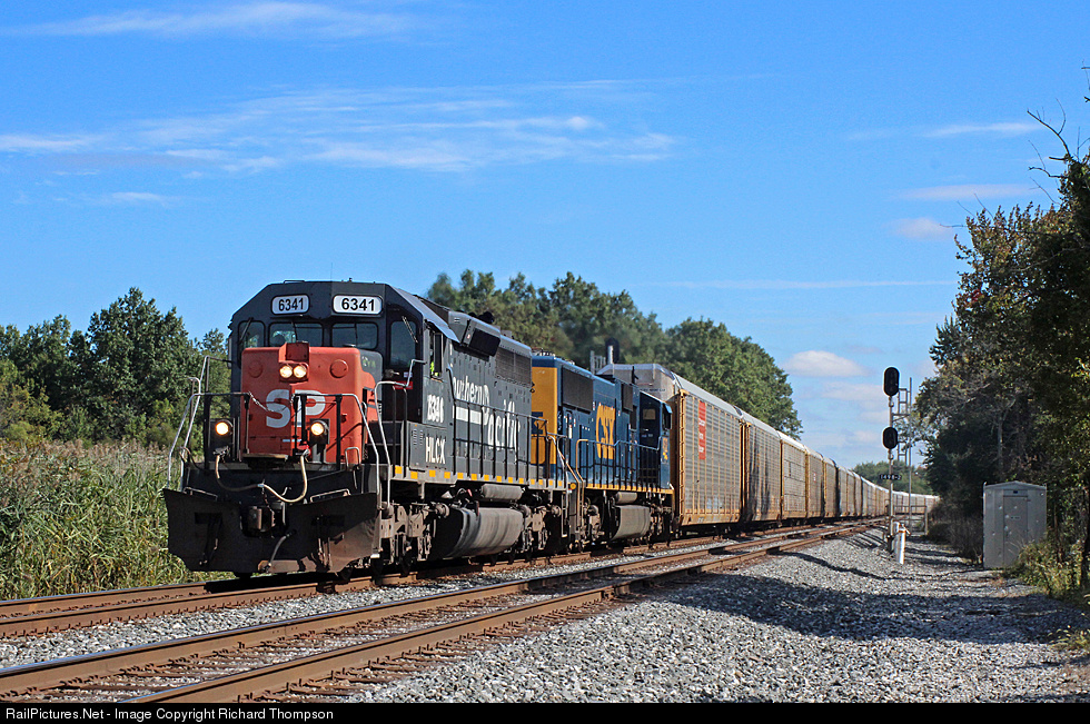 Q299 rushes westbound through Easton, Ohio at milepost BG150 on the CSX New Castle Subdivision with HLCX 6341 at the helm in near perfect Southern Pacific dress. Many crews refer to this signal as "Buck and a half."