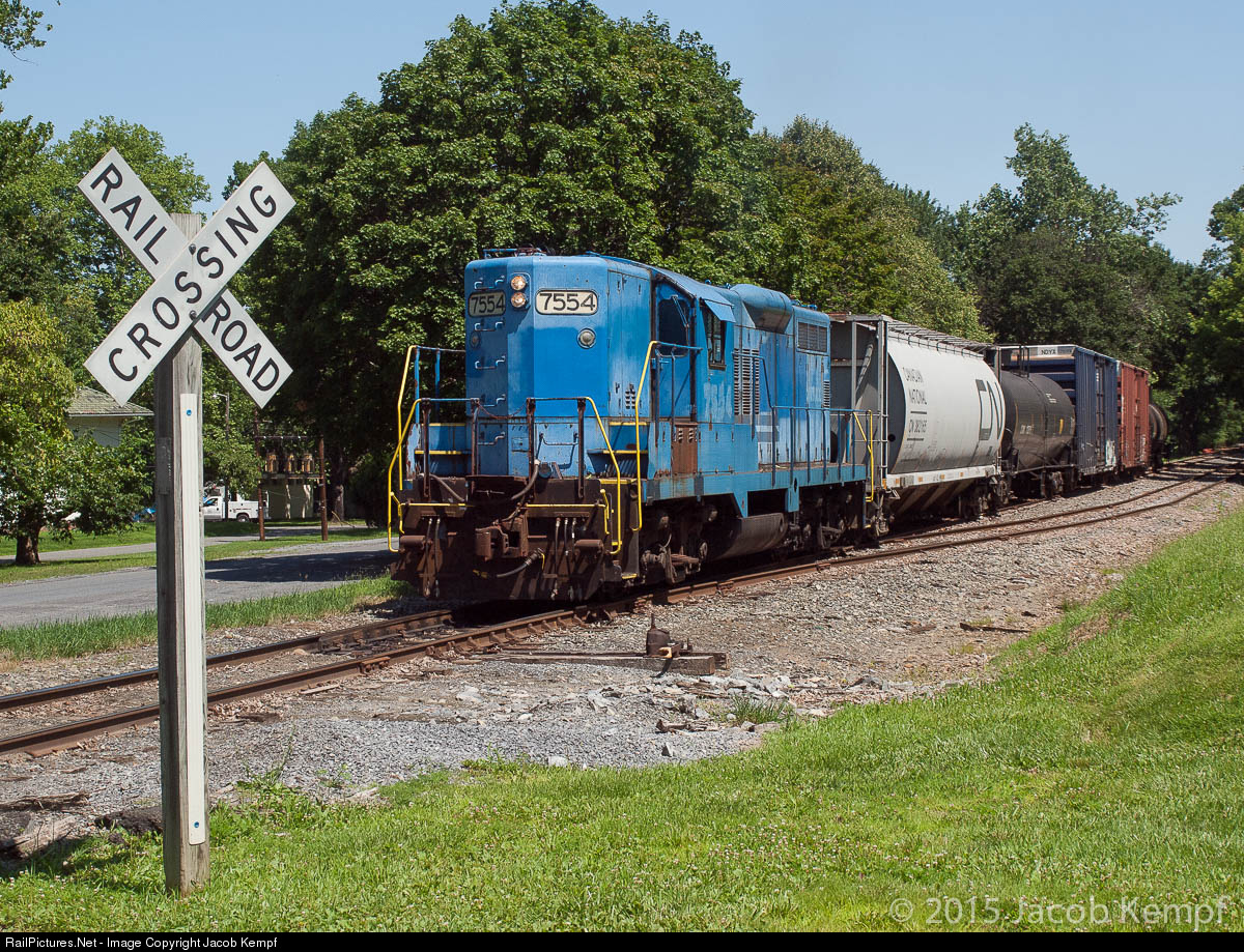 | ESPN 7554, still showing its former Conrail heritage, leads a short train away from the Norfolk Southern interchange as it prepares to cross Klines Lane in Emmaus on a beautiful summer morning. |