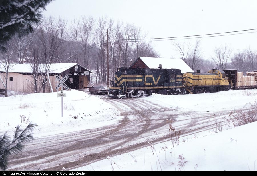 | LVRC borrowed CV 3614 and teamed up with LVRC RS-3 7803. They pass covered bridge on snowy day. LVRC 7802, 7804 & 7805 were down awaiting parts that month. |