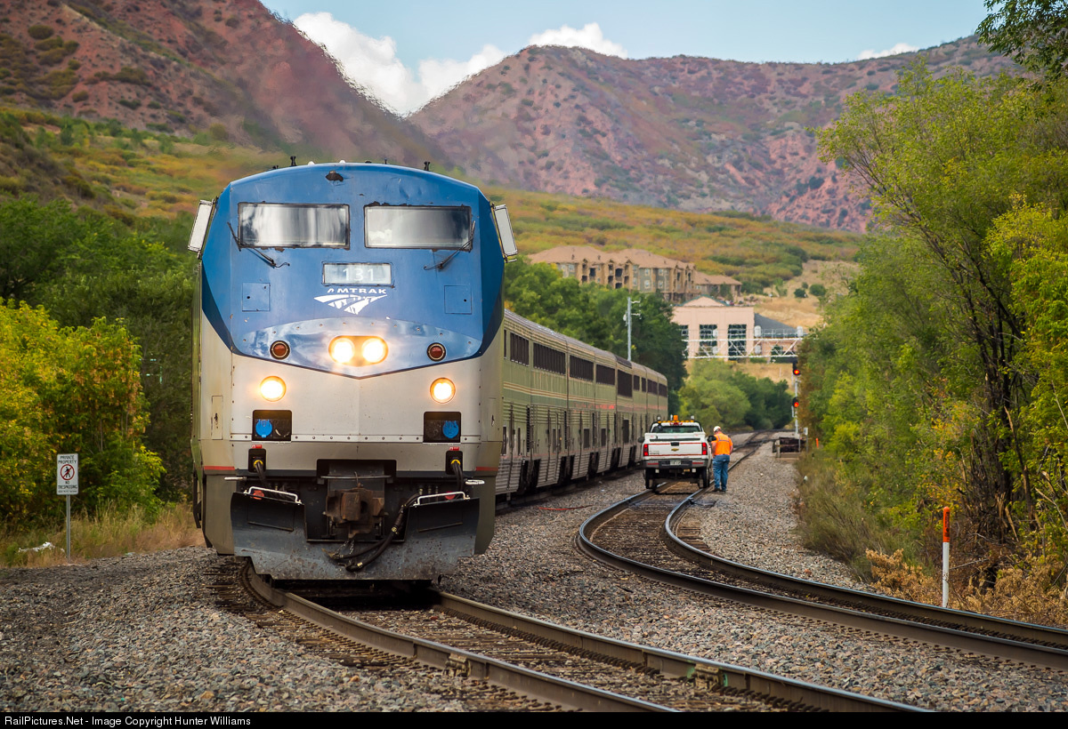 | An eastbound California Zephyr passes a hi-rail truck as it apporaches the depot in Glenwood Springs, CO on October 3, 2015. |