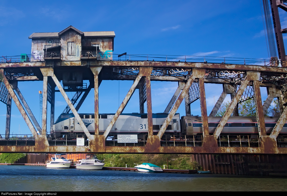 | AMTK 31 leads an Illinois service train south through Chinatown just west of scenic Ping Tom Park. The steel lift bridge has seen better days, but is, of course, still fully functional. Minutes earlier it raised to allow a recreational boat to pass before lowering to allow several trains to cross this busy passage to and from Union Station. |