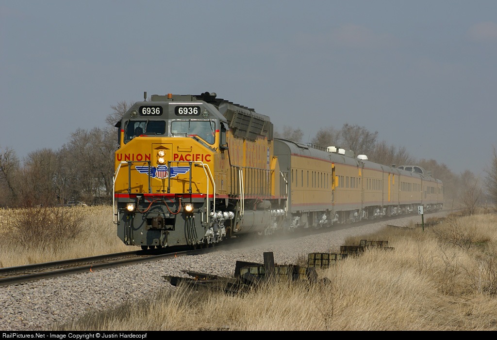 See beautiful diesel locomotives in UP's traditional armour yellow livery and special commemorative paint schemes pulling long trains of yellows cars reminiscent of the days when UP domeliners seemed to go Everywhere West.
