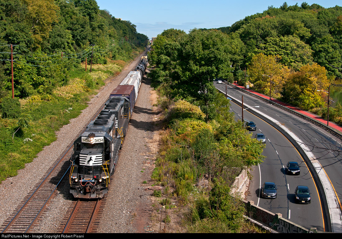 | Conrail JR-2 detours westbound on the Lehigh Line with some classic former Conrail units leading. NS 3434 is ex-CR 6520 and NS 1702 is ex-CR 6659, EL 3674, an SD45-2. JR-2 would normally head south out of Oak Island Yard onto the Garden State Secondary, with traffic for Port Reading and Browns Yards. Trackwork has forced the train to run west to Bound Brook where the power will run around the train before heading east on the Port Reading Secondary. |