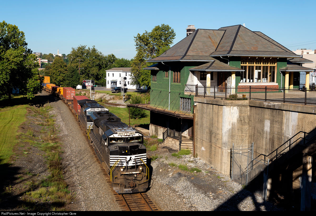 NS 2673 leads a Eastbound stack train past the former CNJ/DL&W Union Station.