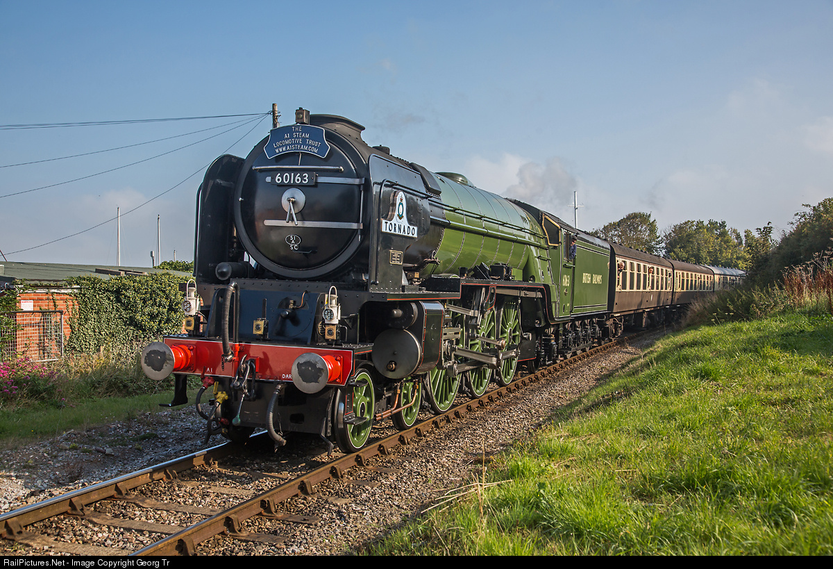 | Three cylinder 4-6-2 of the A1 class # 60163 "Tornado" of the "A1 Steam Locomotive Trust" as guest locomotive with a train from Bishops Lydeard to Minehead on the West Somerset Railway. |