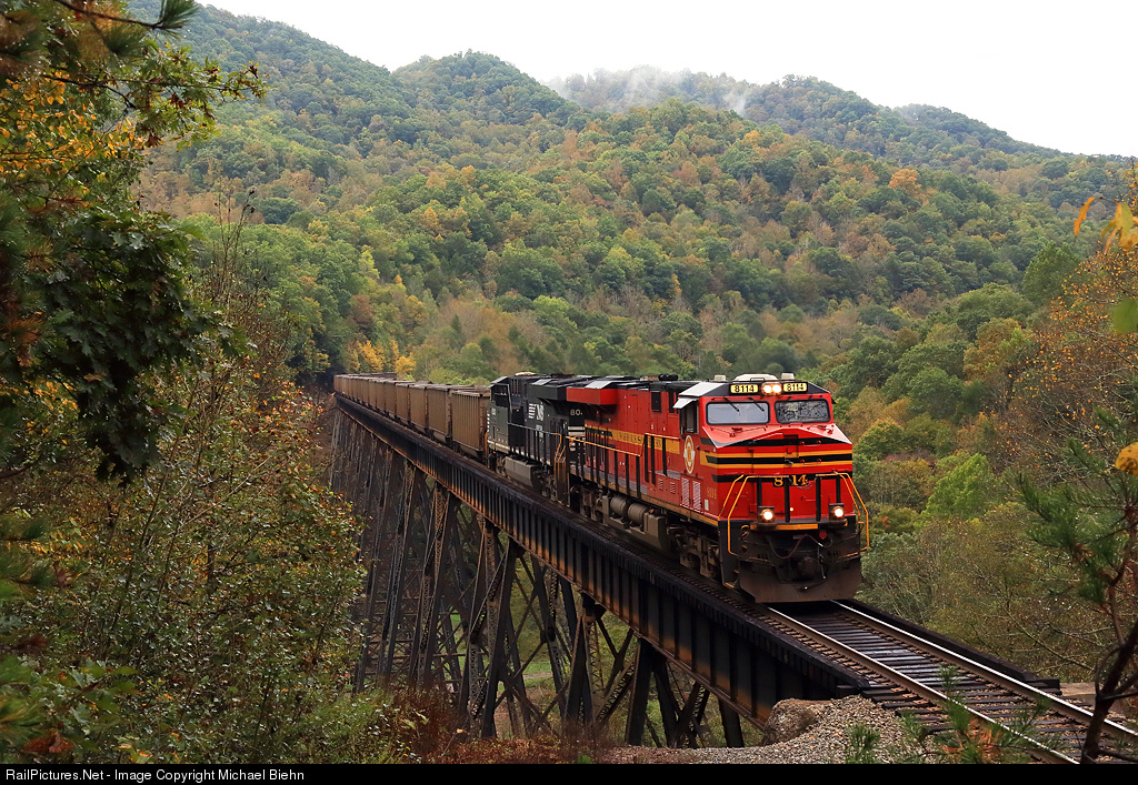 NS Heritage Unit 8114 takes empties downgrade over the Trace Fork Trestle near Amonate, Virginia on the first day of October.