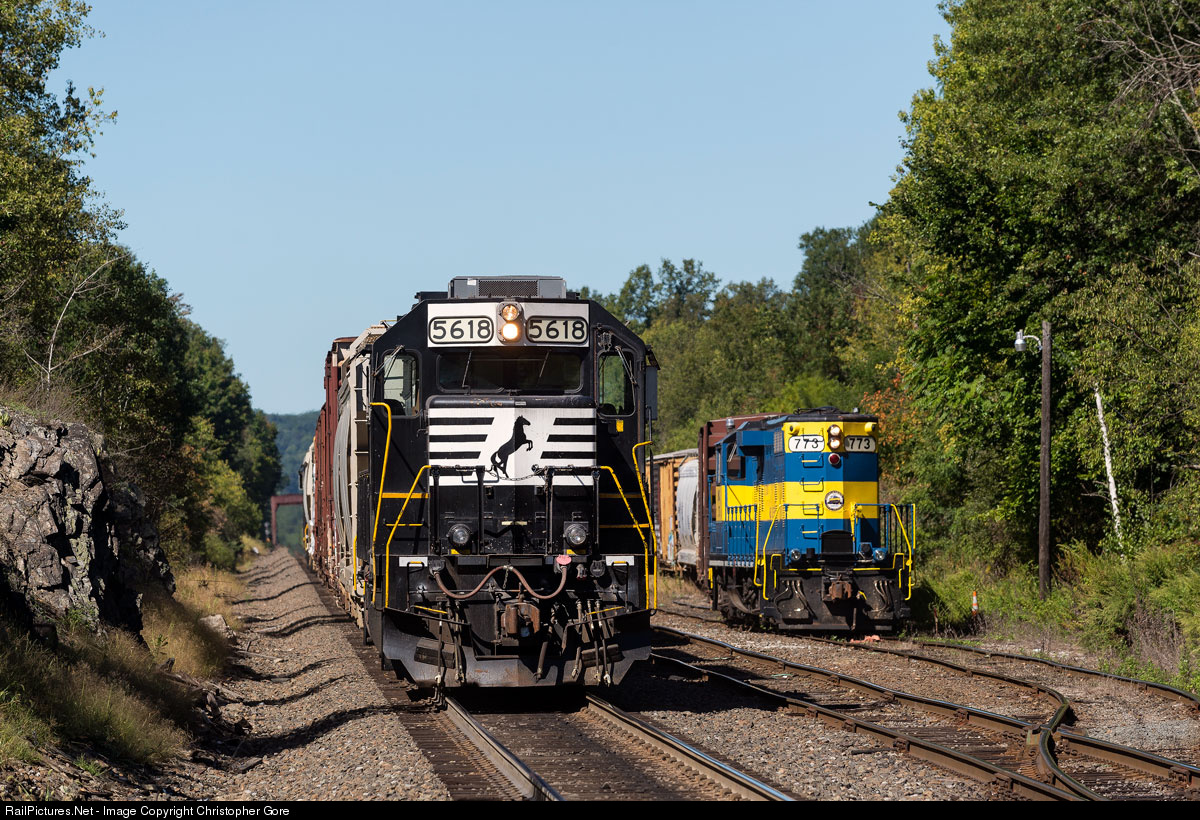 | Running push pull, NS 5618 trails behind the Suffern, New York based local H08. Off to the right Middletown & New Jersey switches cars in the yard at Campbell Hall with GP9u 773. |