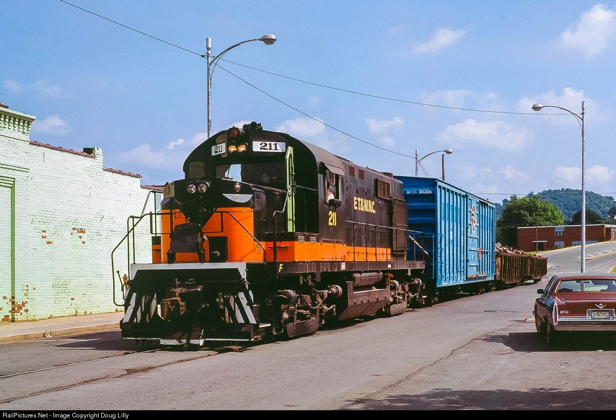 The 66-mile East Tennessee & Western North Carolina Railroad was a noted three-foot-gauge empire that at its peak reached from Johnson City, Tennessee through the mountains to Boone, North Carolina. Retrenchments in 1940 and again in 1950 left an eleven mile dual-gauge line between Johnson City and Elizabethton, Tennessee. The road operated with two ex-Southern 2-8-0’s well into the 1960’s, until they were replaced by two ex-Southern RS3’s. The RS3’s were eventually retired in favor of a pair of ex-SP RS32’s, one of which is shown here navigating street trackage in Elizabethton. The gondolas of scrap are from the Elizabethton Herb and Metal Company, purveyors of scrap iron and fine herbs. In another year the 102-year-old ET&WNC would cease to exist, with its route being taken over by the East Tennessee Railway.