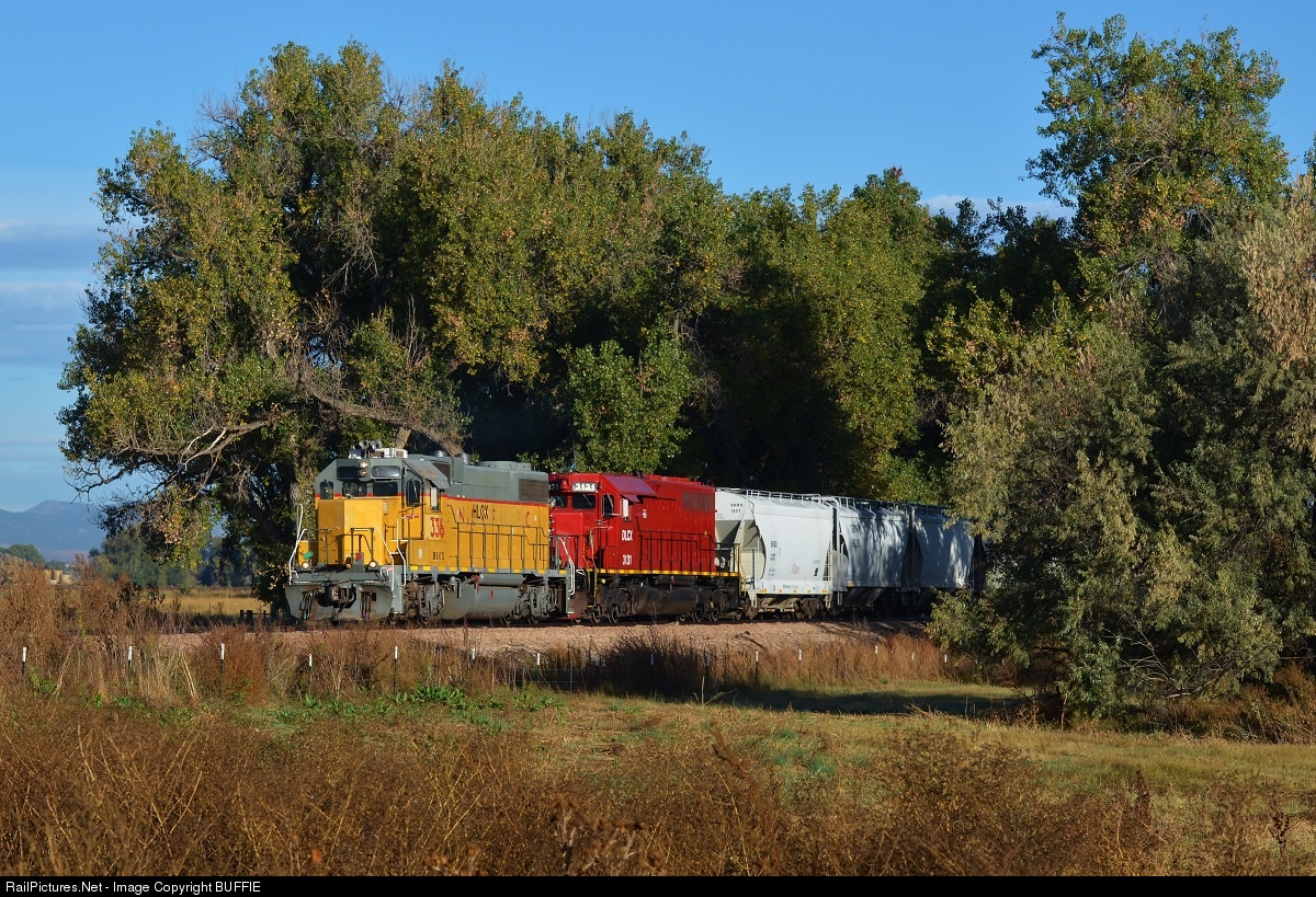 | HLCX 336 (Ex Missouri Pacific GP38-2) and DLCX 3131 (Ex Kansas City Southern SD40-2) exit a tree canopy as they work their way towards Johnstown, Colorado. Pretty soon the fall leaves will match the colors of the engines. |