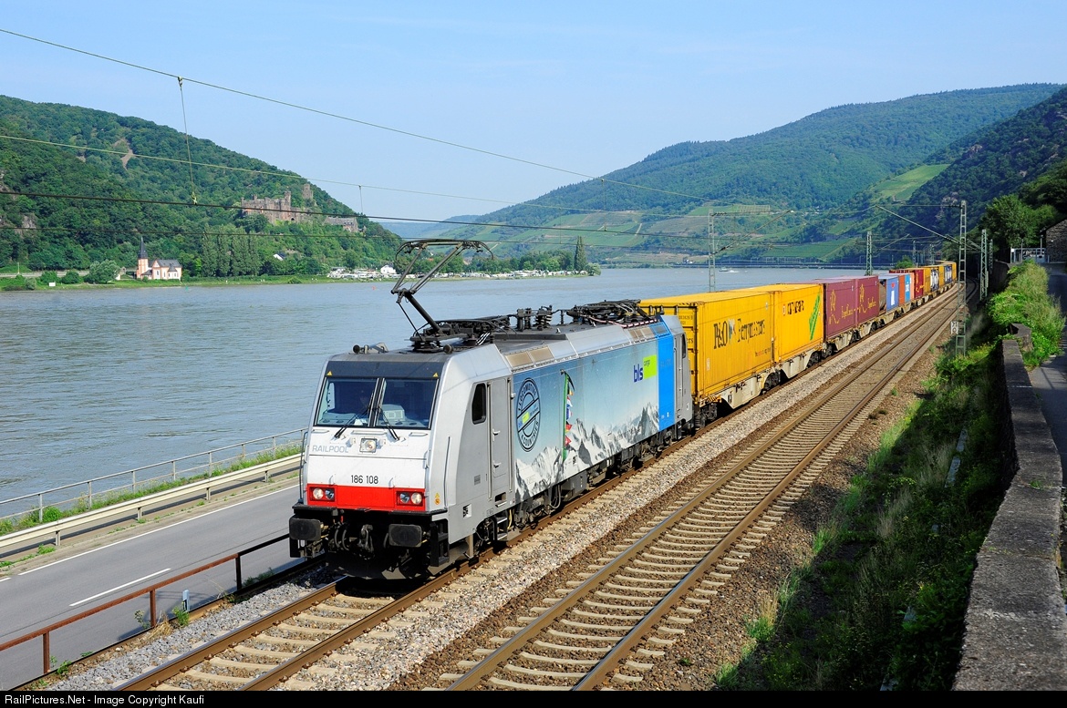 | BR 186 108, rented by BLS Cargo, is pulling a long freight train southbound along the Rhine. |