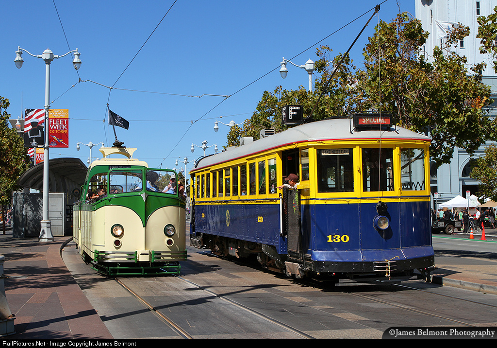 | MUNI No. 233, built in 1934 by English Electric for Blackpool tramways and MUNI 130, built in 1914 by Jewett Car Co. for San Francisco Municipal Railway meet at the Ferry Building in San Francisco during MUNI Heritage Weekend, 2015. |