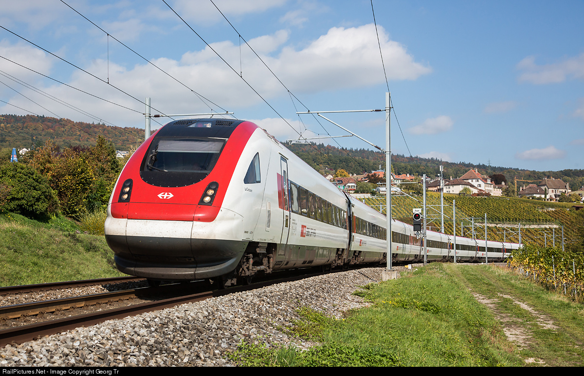 | Intercity tilt train ICN RABDe 500 # 000 (first of the series) "Le Corbusier" as train ICN 522 from St.Gallen to Geneva Airport, near Auvernier. |