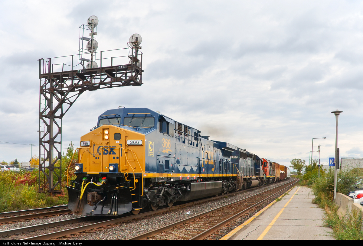 CSXT's Chessie unit in Canada. Fresh out of the paint booth, CSXT 366 (with 'Chessie System' decal applied on the nose) leads CN 327 through Dorval. Trailing are two veteran EMD units (ex-BN SD40-2 HLCX 7187 and GP38-2 CN 4703).
