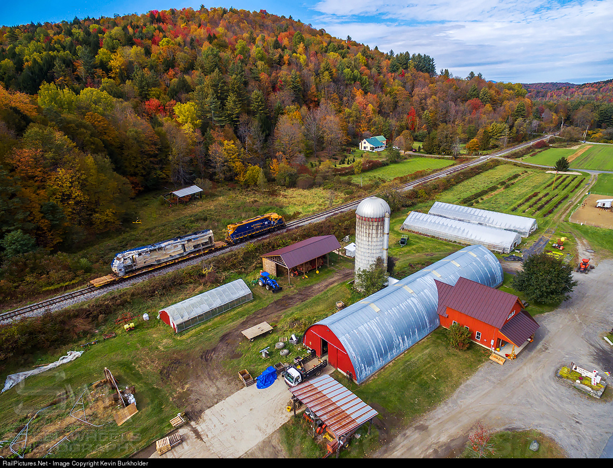 New England Central GP38 3851 is moving damaged Amtrak P42DC #102 northbound toward Montpelier Jct., Vermont, past the Dog River Farm on Sunday, October 11. The Amtrak P42 had just been moved onto the flat car in Northfield, VT and was being taken to Montpelier Jct. where crews would further secure the locomotive to the flat for transportation to Beech Grove, IN and further evaluation.