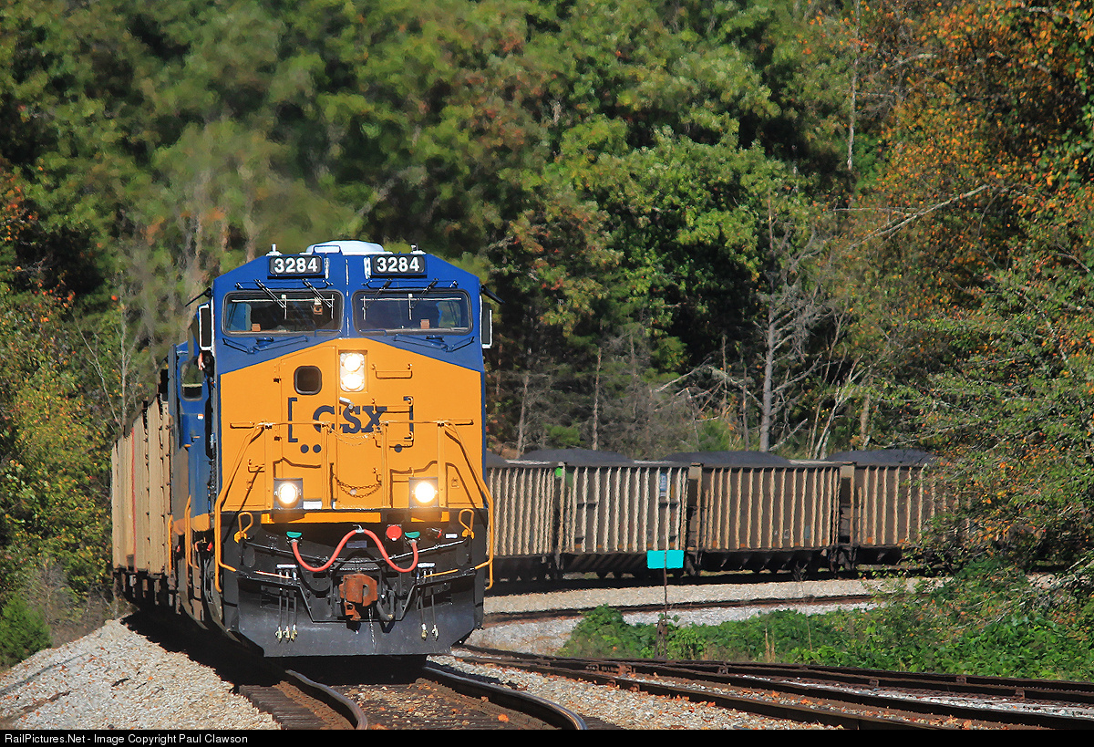 | CSXT 3284 One of the new ET44AH Tier 4 Locomtives bought by CSX is assisting the loaded coal train to Watkins, VA through by the Hubbard Springs siding and is slowing down in order to flag a grade crossing at the 252.9 which has been reported as malfunctioning. ( randomly rining and gates going up and down all day) |