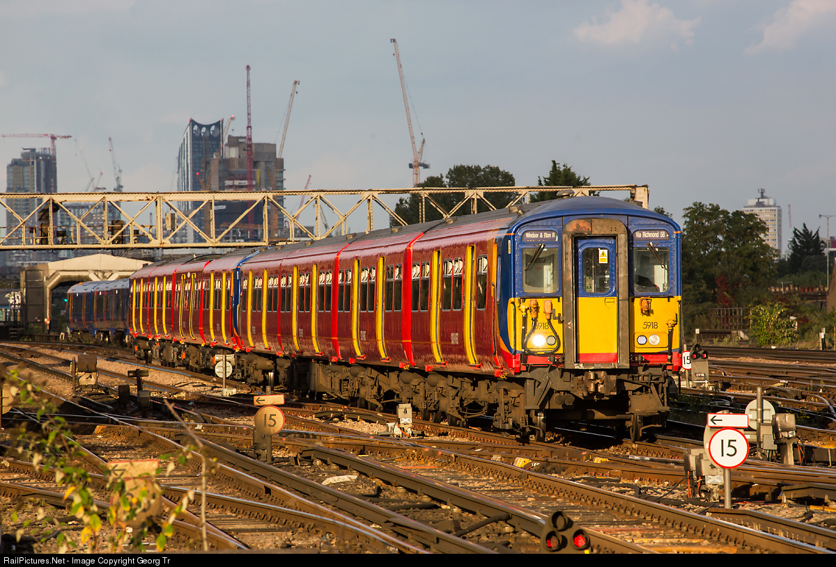 | Clapham Junction is Britain's busiest railway station with more then 2000 trains a day. Two 4 car trainsets 455/9 are entering Clapham Junction from London Waterloo. This trains operate with 750 V DC from third rail. |