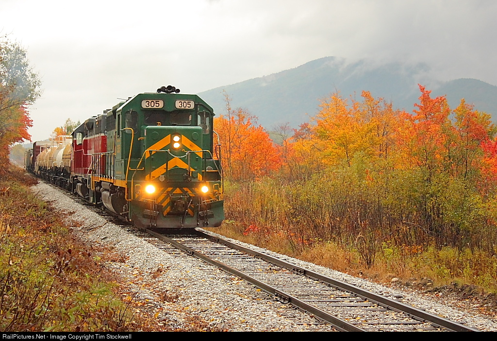 On Friday, I paid what has become a nearly annual visit to Vermont Railway's B&R Subdivision between Rutland and North Bennington, Vermont. With the exception of 2010 and 2012, I've visited the line every October since 2008. It's been 6 years (2009) since I last photographed the B&R Job under sunny skies in October, and this year would prove to be no exception. In fact, this time I also I had to contend with pouring rain. In 2013 and 2014, engines in leased paint led the trains I caught. Why on earth, then, would I dare come back? The answer: the spectacular Fall foliage that can be found along this line. This year--in addition to decent Fall foliage--I also managed to catch a non-leased-painted engine leading. Even better, it was one of the Green Mountain GP40s--the 305--which last I heard was supposed to be leaving the property. In any case, the GMRC 305 and nice Fall color combined to produce some images I was satisfied with. Here, the train heads south through Danby, Vermont.