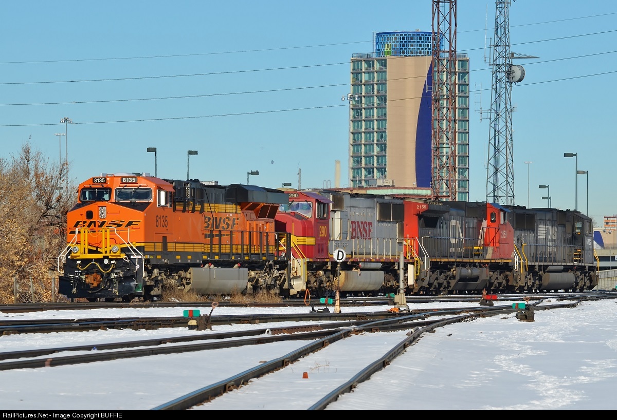 | An interesting three-flag consist heads to the Denver Yard to pick up a mixed freight. Included is BNSF 8135 (ES44C4), Warbonnet 290 (SD75I), Canadian National 2159 (C40-8W) and Norfolk Southern 6732 (SD60I). |