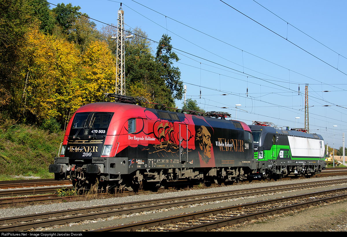 | On the occasion of the 200th birth anniversary of prominent German composer and conductor Richard Wagner was introduced on July 17 in Sopron locomotive 470 503-3 in a new advertising stickers on a musical theme. Original color solution, which dominated the corporate colors GySEV and brown motifs keyboard and profile of Franz Liszt, was completely altered and modified. On the machine, now dominated by the colors red and black motifs referring to the life's work of the German composer. (Station Lambach-WESTBAHN Wien - Linz). |