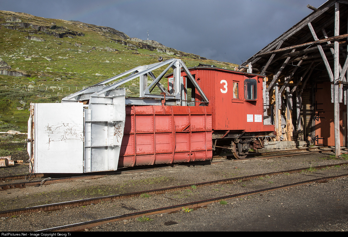 Special snow fighting equipment of the Bergen line in Norway, now part of the Rallarmuseet (navvies museum) in Finse, Norways highest railway station on 1222 meter a.s.l. Working direction of this plow was from left to right, towed by a locomotive. The red metal sheets were mechanically extended and attracted the snow from both sides of the track into the rail. The silver plates on the left were moved apart, so that the snow was able to leave the plow. Then the snow lying in middle of the track was hurled away with the steam snow blower. This snow plow was built in Kronstad in 1916, the frame is from Skarbo in 1905. The same technique was used till a few years ago on the Bernina line of the RhB in Switzerland.