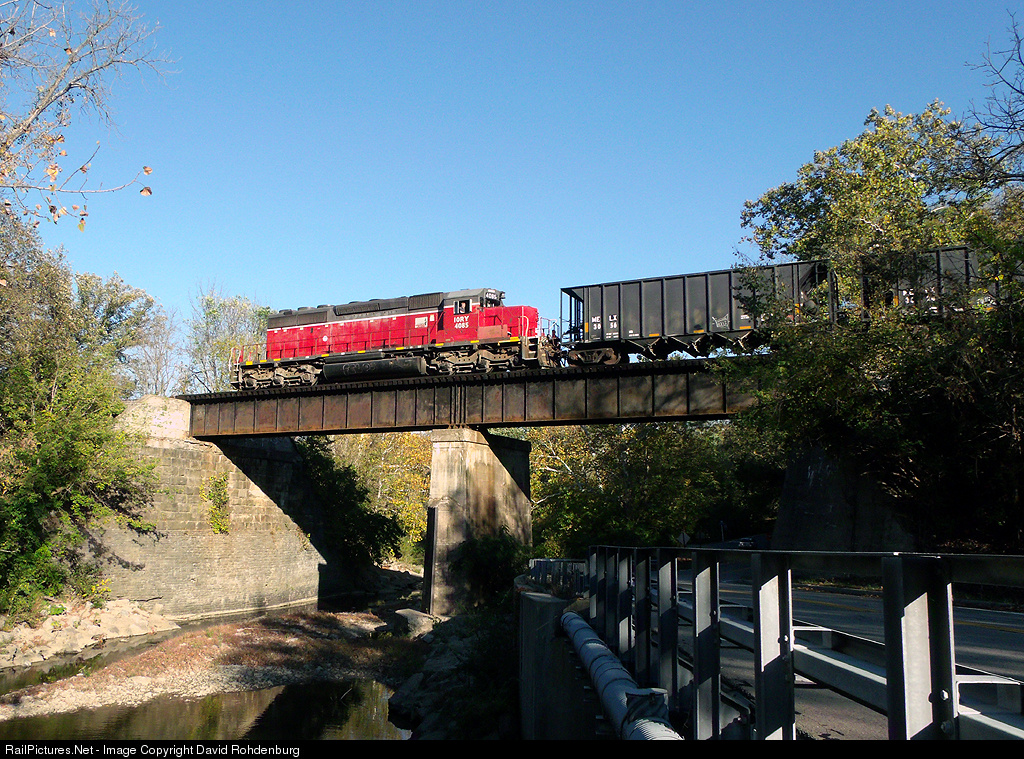 | The Indiana & Ohio Railway's Melvin Rockrunner cruises across the trestle that carries the Midland Subdivision over Sycamore Creek and Spooky Hollow Road in Remington, headed back to the Melvin Stone Quarry in Melvin, Ohio for another load of rock. |