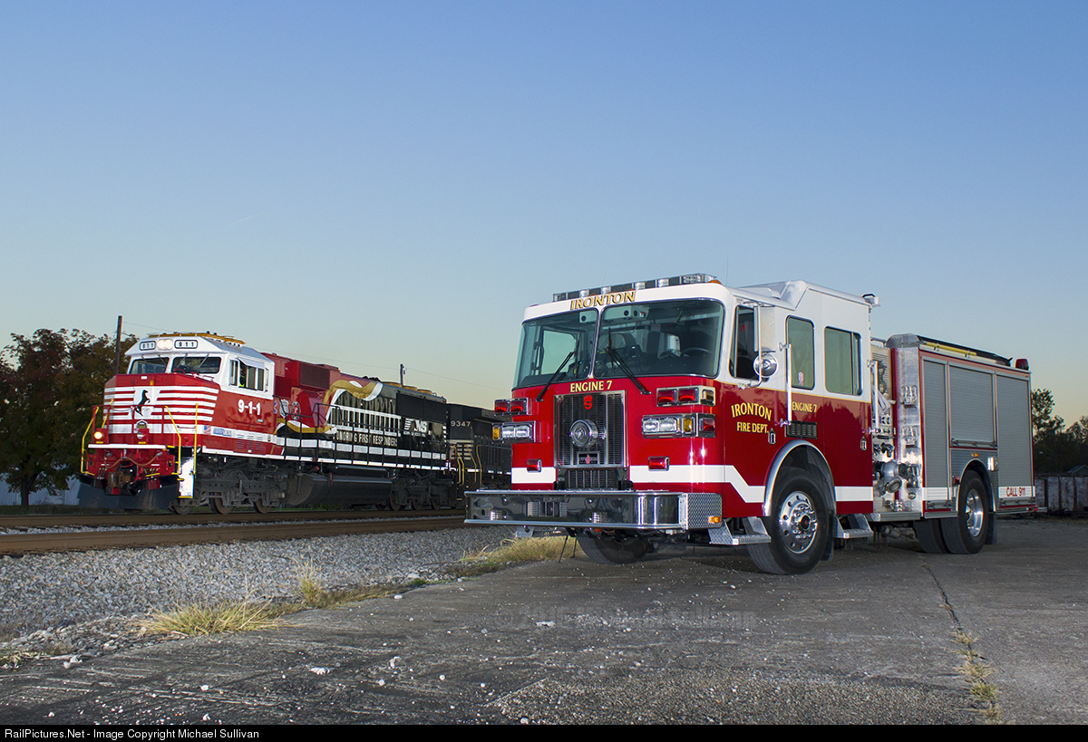 In the last minutes of a clear October evening, westbound hopper train 66V dashes through the town of Ironton with the Norfolk Southern "Honoring First Responders" heritage unit at the lead, the first time this unique locomotive has traversed the ex-Norfolk & Western mainline. Ironton Fire's Engine 7, a 2007 Sutphen pumper, poses on the concrete pad between the mainline and the former DT&I Ironton Branch lead. A big thank you to the City of Ironton Fire Department for their assistance!
