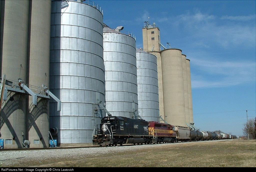 IC SD40-2R 6007 leads WC SD45 6620 past Ludlow's grain silos.