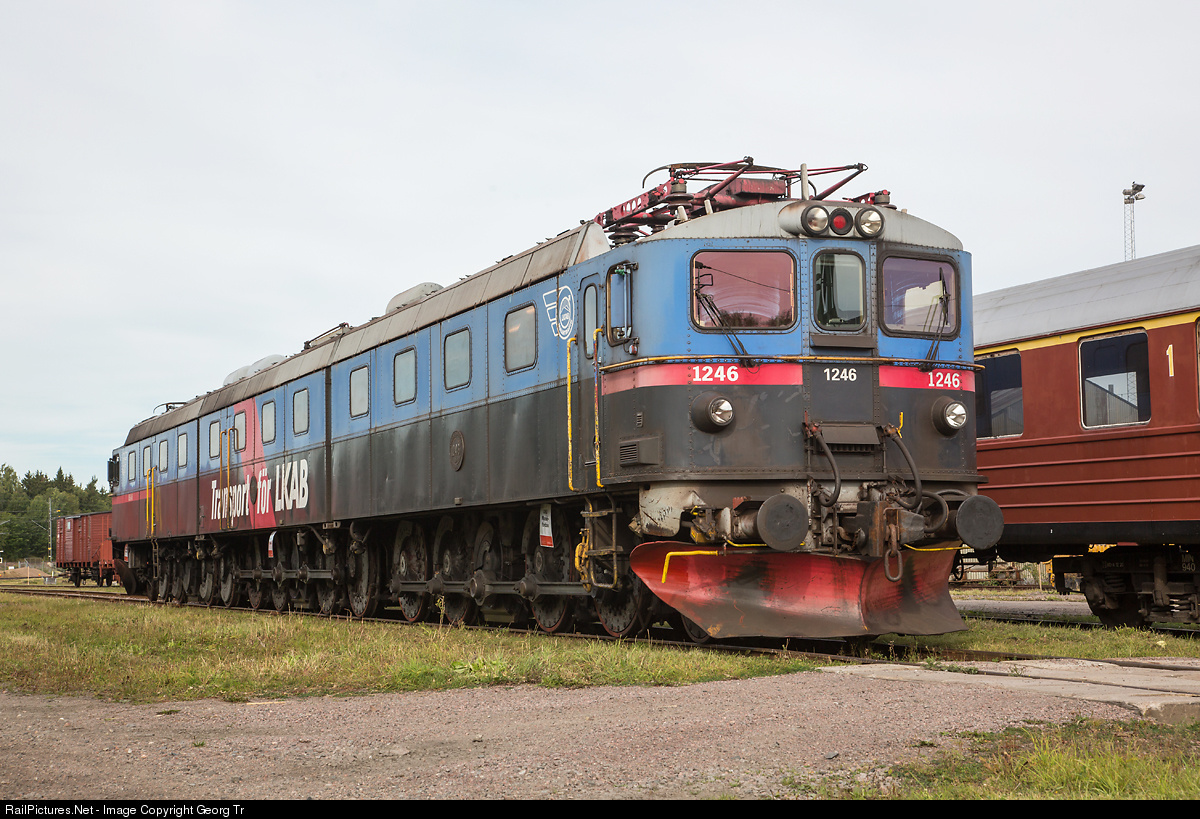 | The 273 ton three sections ore line locomotive Dm3 # 1246-1247-1248 "Oskar" with 7200 kW and rod drive was built by ASEA in 1970 for the line from Kiruna to Narvik, where she pulled 5200 ton ore trains. 2013 the locomotive was withdrawn and donated by the LKAB to the Swedish Railway Museum in Gävle. |