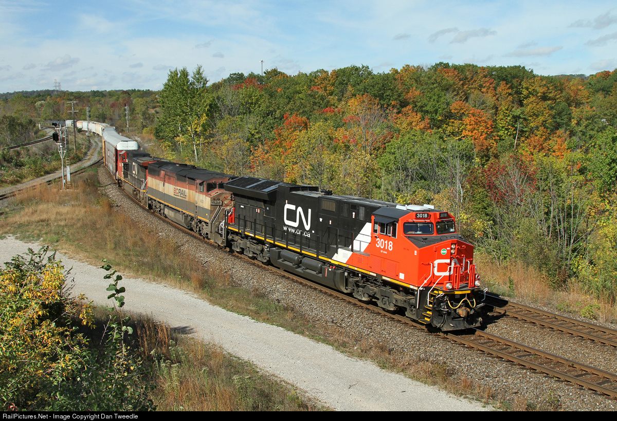 CN 3018, still looking quite fresh after a few weeks of service, leads BCOL 4620 and 2164 into the S-curve at Bayview.