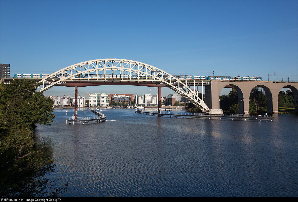 4 coupled X 10 electric railcars of the SL are crossing the 753 meter long and 26 meter high Årsta bridge from the isle Södermalm to the south mainland. The bridge, on its completion in 1929 the longest bridge in Sweden, was designed by the architect Cyrillus Johansson (1884–1959) and the engineers Ernst Nilsson (1874–1946) and Salomon Kasarnowsky (1887–1960). It has often been compared to a classical Roman aqueduct, and is today declared a historical landmark.