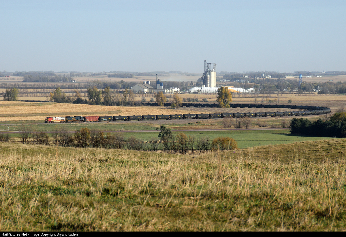 Oil loads sweep around a curve south of Ruthton along BNSF's Marshall Subdivision behind a Warbonnet and visiting CSX power.