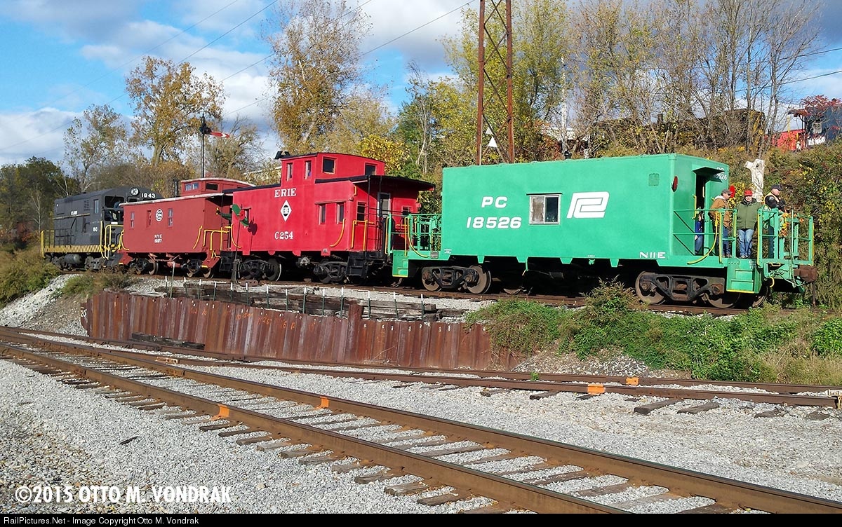| Former U.S. Army Fairbanks-Morse H12-44 No. 1843 is in charge of a rare three-car train consisting of New York Central, Erie Railroad, and Penn Central cabooses at the Rochester & Genesee Valley Railroad Museum. The NYC caboose was a recent addition to cope with larger than normal fall foliage attendance at the museum. Tracks in the foreground belong to the Livonia, Avon & Lakeville Railroad. |
