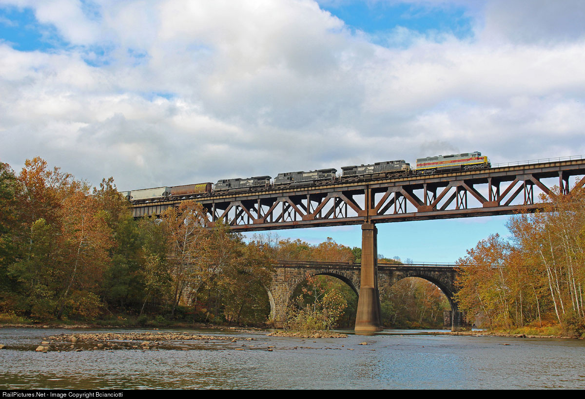 NS 10N is led by the newly painted erie lackawanna heritage unit. this sd45-2 is back in its original paint job as it is an ex erie lackawanna unit. Picture above is 10N with 1700 leading the train over the conemaugh river bridge outside of Blairsville,Pa. Soon 10N will be off the conemaugh line and back on the ns pittsburgh line