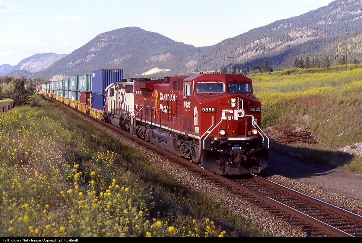 | CP 9585 and a SOO Line loco are westbound at Pritchard, BC, in 2004. Were SOO Line locos often seen in British Columbia? |