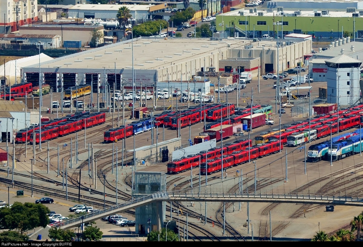 | In this photo of the San Diego MTS (Metro Transit System) station we can see a number of red S70 units, an EMD F59PHI and F40PH-3C at the head end of the Coaster trains, as well as a couple vintage trolleys that will head out for the evening runs downtown. |