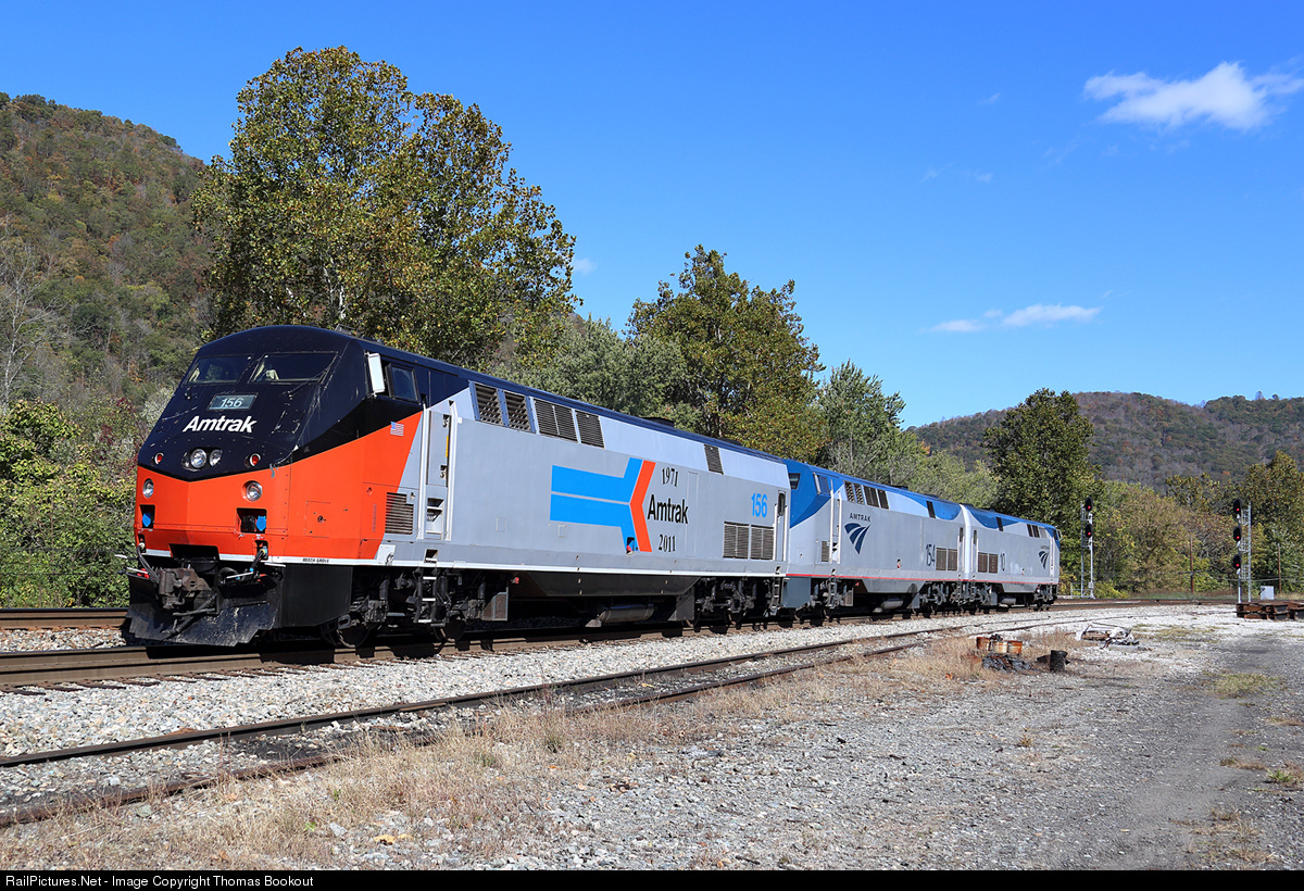 | Amtrak's phase I heritage unit led the 2015 New River Train eastbound. At Hinton, the three locomotives with the 156 on the east end have uncoupled from their train and run around to the west end for the trip back to Huntington later in the afternoon. |