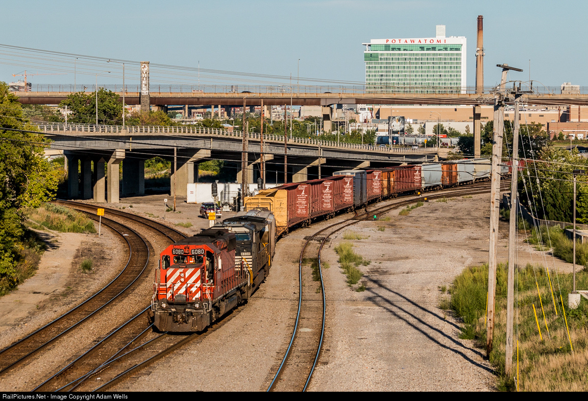 | Looking a bit worse for wear, one of the few remaining CP SD40's leads 289's train out of Muskego Yard in Milwaukee before heading west on the Watertown Sub. |