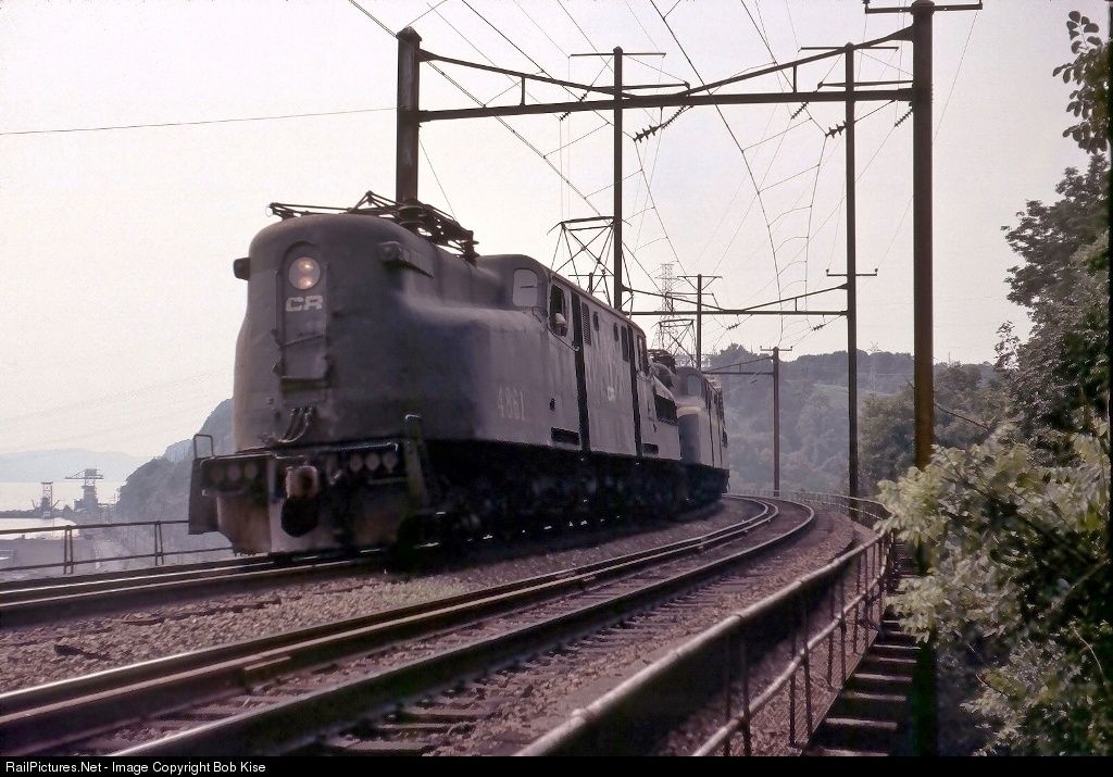 The CR 4861 East and a yellow-striped sister fly high above the Susquehanna River on the way to Parkesburg and beyond. Safe Harbor dam is seen in the lower left, almost 150 feet below the rails of the old PRR Atglen & Susquehanna Branch. Today, the rails and trolley wire are gone, but you can hike and bike on either side of the bridge. The long-term goal is to open the bridge to trail-users, possibly by 2017. The 4861 was built by PRR/GE in December, 1937.