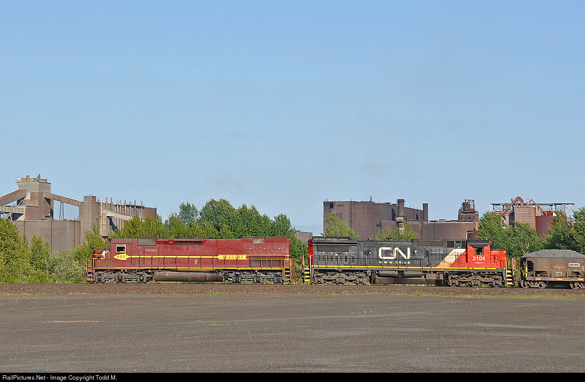 | DMIR 403 leads cars of taconite rock towards the United Taconite Fairlane plant in Forbes, MN nearly completing the 10 mile trip from the mine near Eveleth, MN. The plant, once owned by the Ford Motor Co. produced its first pellets in 1965 and has an annual rated capacity of 5.2 million gross tons per year. Ford's influence remains today in the names of the mine's facilities-the Thunderbird Mine and the Fairlane plant which can still be out on the building.