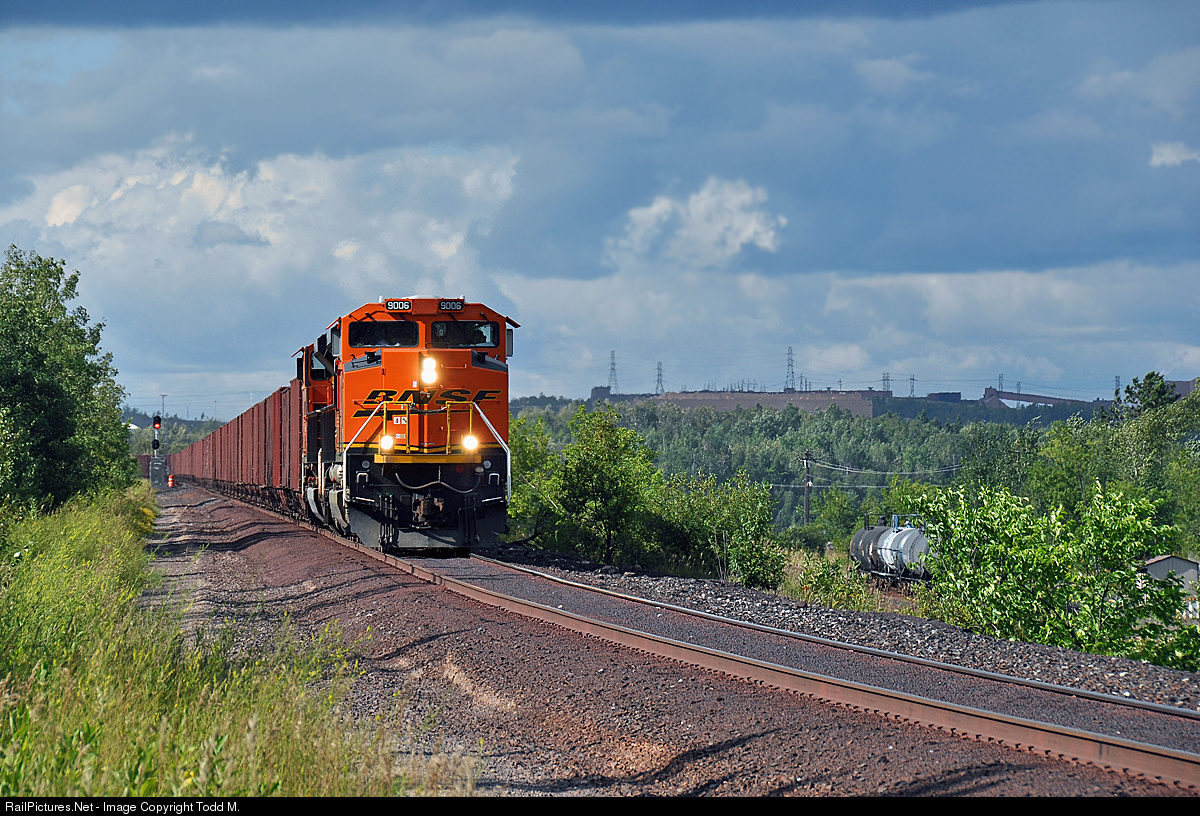 | A fairly clean BNSF SD70ACe leads 123 cars of taconite pellets off the U.S. Steel Minntac property on the start of the lengthy journey to the steel mill with the 15,000 ton train. |