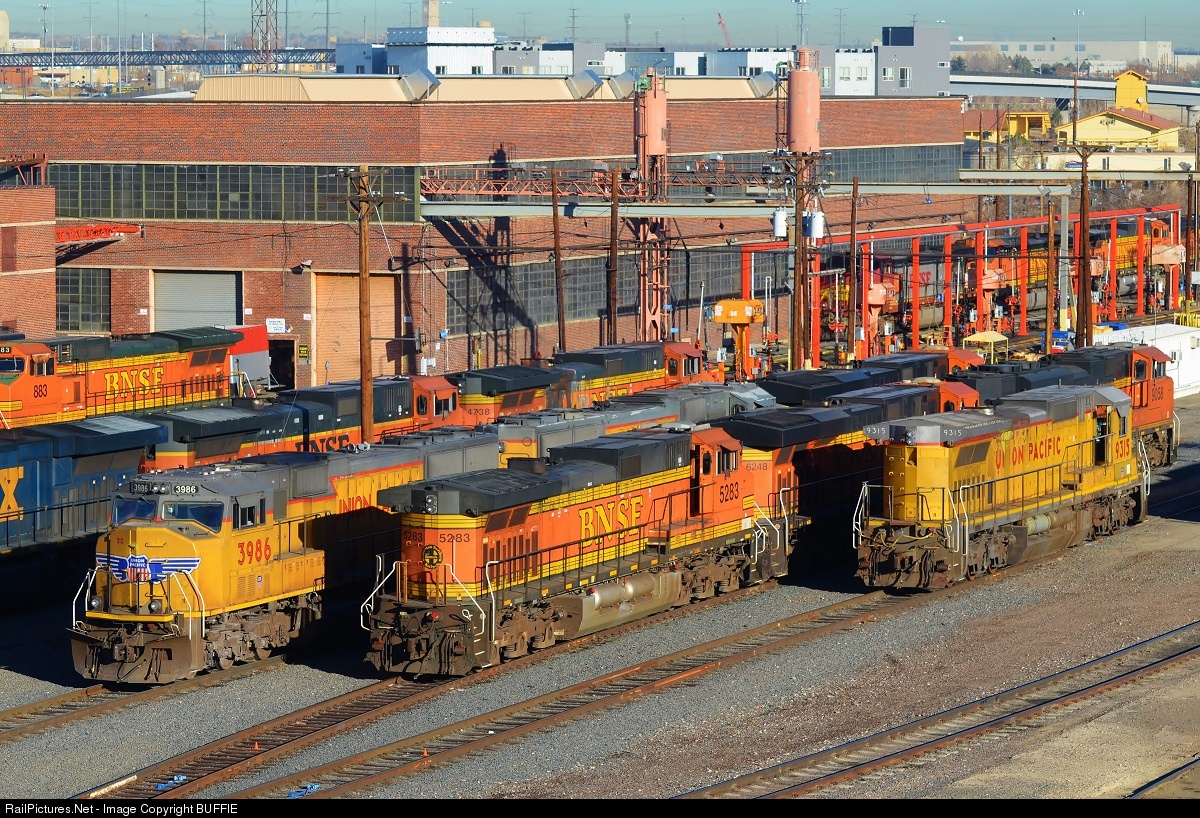 UP and BNSF share the yard at the BNSF engine servicing facility in Denver. UP 3986 (SD70M) used to run for the Southern Pacific.