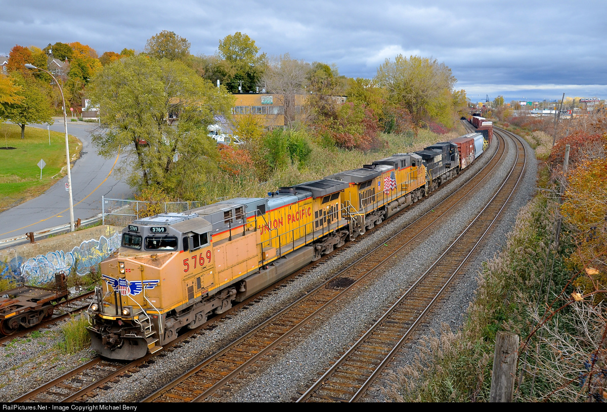| Two UP AC4400CW's in Montreal. About 24 hours after arriving in Rouses Point, NY as CP 931, CN 529 has arrived in Montreal with two UP AC4400CW's leading an NS Dash9 (UP 5769, UP 5615 & NS 9166) as it passes through Montreal West on its way to nearby Taschereau Yard. |