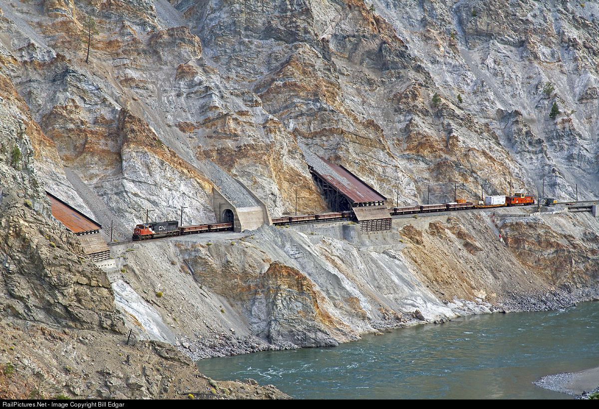 | CN 5731 completes a back up move from Lasha siding just east of Lytton, BC to the Rainbow Canyon area near Skihist Park. The train will load Difco dump cars with the ongoing debris that slides done the canyon walls, then back the train to Spences Bridge to unload. This appears to be a constant effort to keep the CN mainline fluid for rail traffic. |